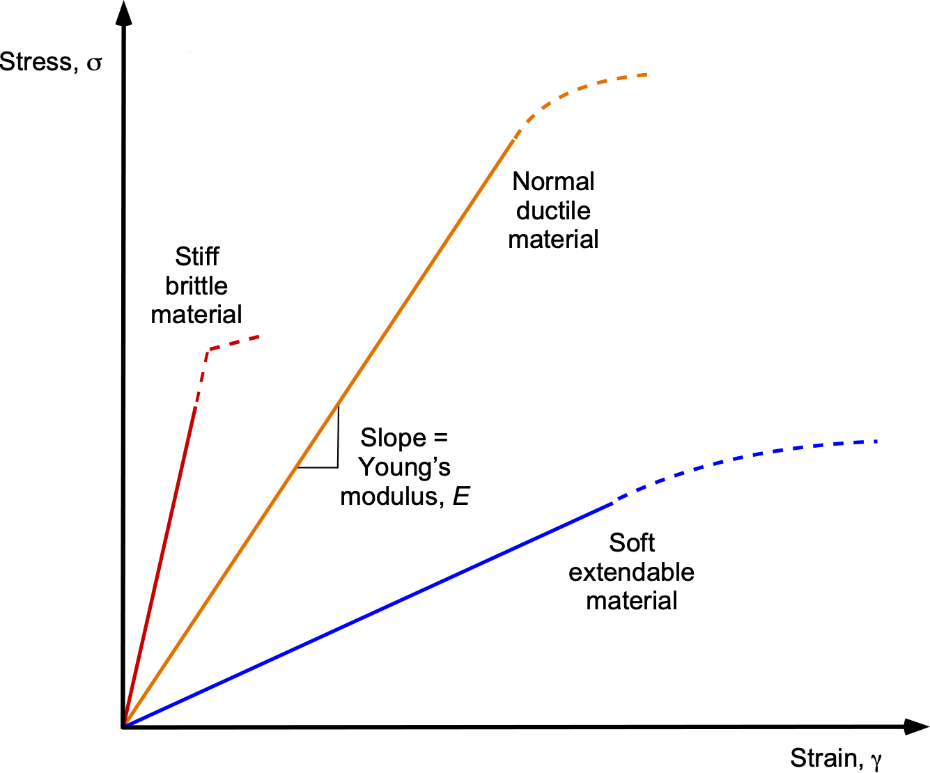 Stiff materials have a higher Young’s modulus value but tend to be brittle, fracturing easily. Soft, easily extendable materials have lower Young’s moduli.