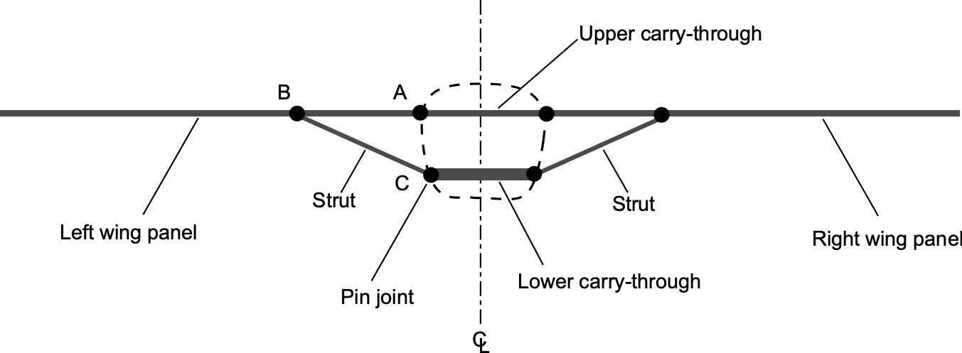 To study the internal forces in such a structure, the wing and its bracing elements can be idealized as a pin-jointed framework composed of the wing panels, the upper and lower carry-through members in the fuselage, and the left and right diagonal struts. Under steady-level flight, the wing panels carry a distributed aerodynamic lift, and the combined structure transfers this load to the fuselage through a system of axial forces in the struts and carry-throughs, as well as shear and bending in the wing beams.