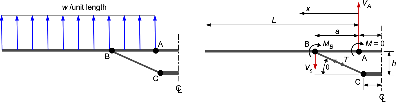 Consider the left half of a strut-braced wing, idealized as shown in the figure below. The wing panel extends from the root pin at to the free tip at