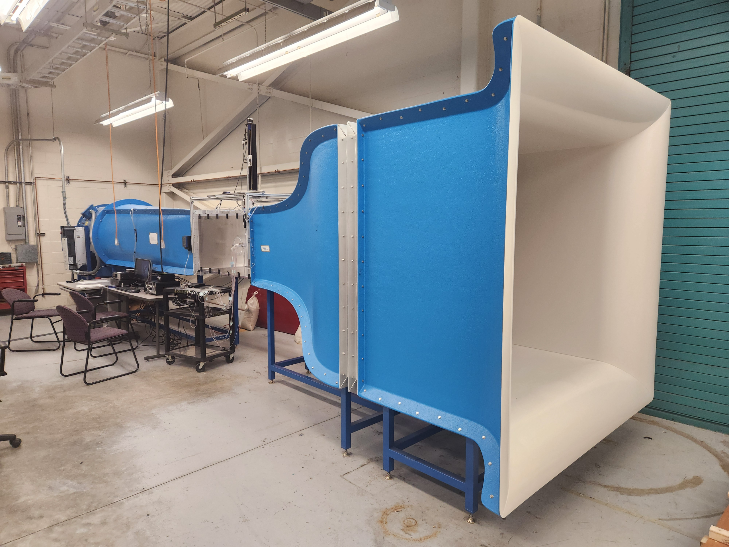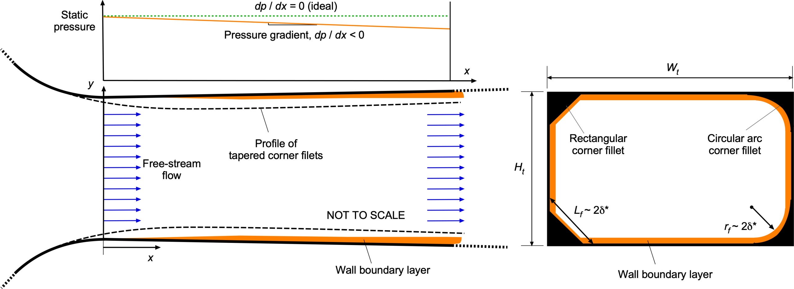The shape of the test section is designed to minimize boundary layer effects and ensure a uniform, low-distortion flow. Corner fillets are incorporated to suppress flow separation in the corners and are tapered to zero along their length toward the downstream end. As the flow progresses downstream, viscous effects cause boundary layers to develop and grow along all four walls of the rectangular test section. This growth reduces the effective flow area, causing the core flow velocity to accelerate. To maintain uniform velocity and avoid adverse pressure gradients, the cross-sectional area of the test section is gradually increased to compensate for the displacement thickness of the boundary layers. If left uncorrected, these pressure gradients can introduce horizontal buoyancy effects and distort force measurements, particularly the drag.