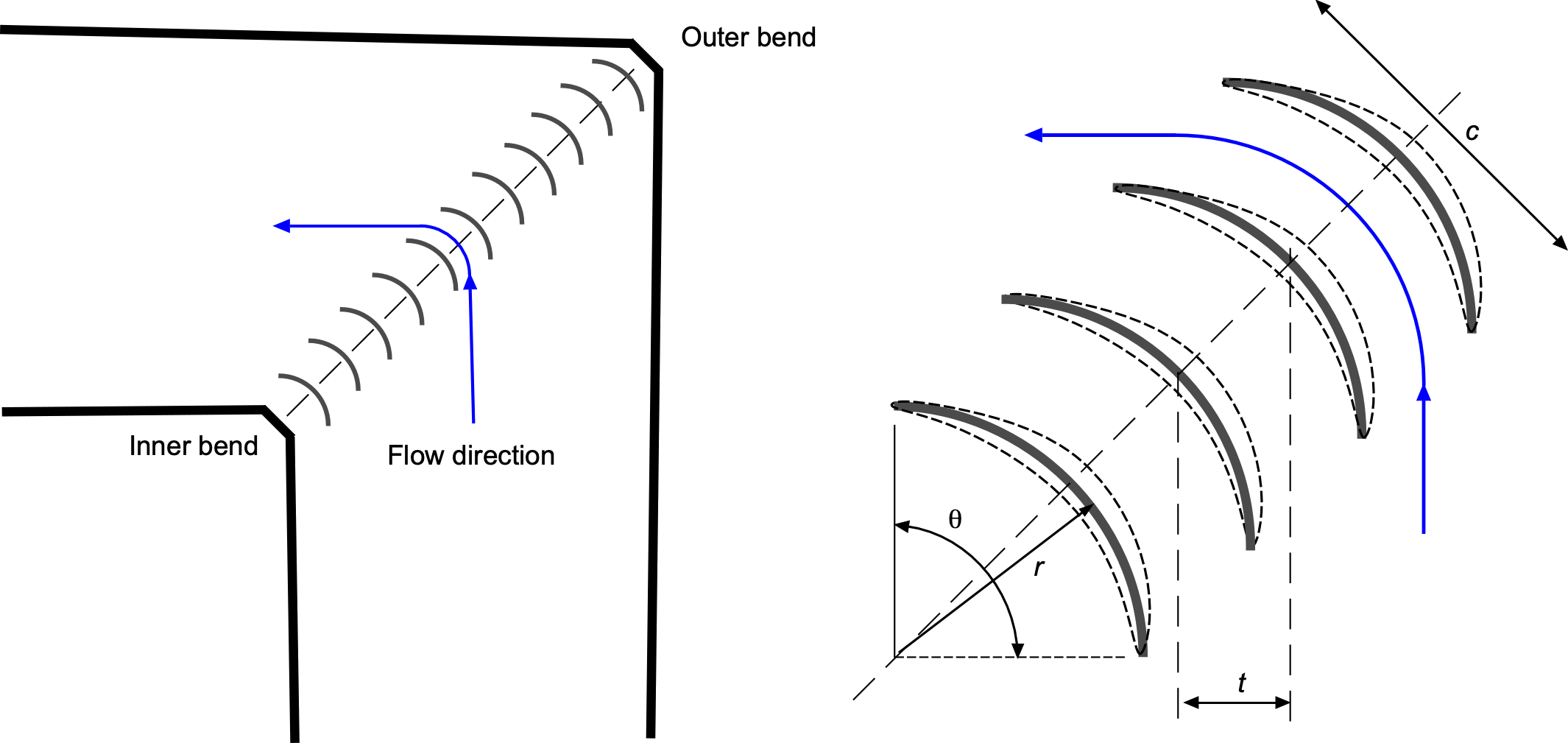 The purpose of the first cross-leg diffuser, spanning from corner 1 to corner 2, is to redirect the flow, expand it further, and slow it down as it approaches the fan. Each corner employs a cascade of circular-arc airfoil guide vanes with sufficient area or solidity to prevent separation and the formation of secondary vortices. These vane cascades allow the flow to turn efficiently, suppressing swirl and turbulence build-up, and help maintain total-pressure losses at only a few percent of the total losses per corner.