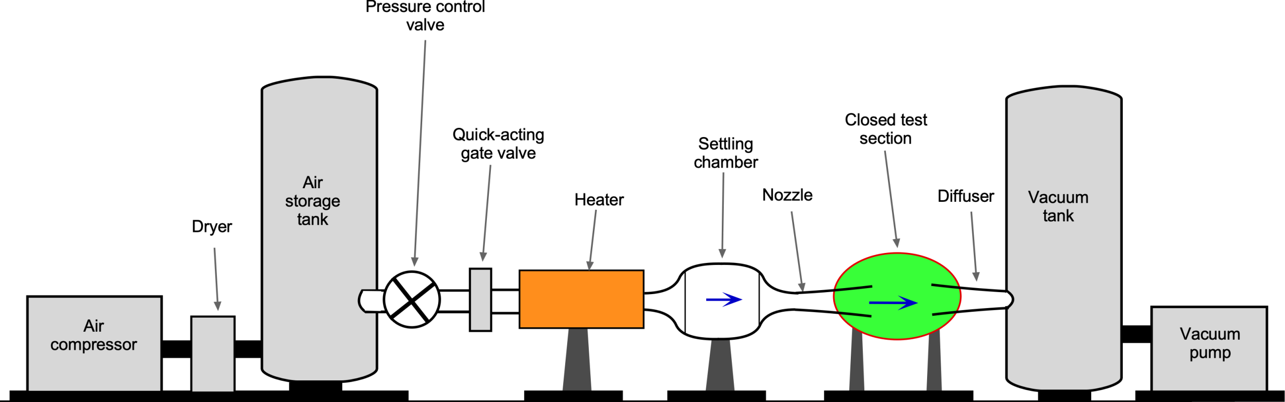 Downstream of the test section, a <em>supersonic diffuser</em> decelerates the flow through a series of weak oblique shocks before returning it to subsonic speed. The diffuser then exhausts either directly to the atmosphere or, in short-duration facilities, to a low-pressure reservoir to maintain the desired pressure ratio across the nozzle. Proper diffuser design is essential to prevent flow unstart and ensure stable operation. The overall tunnel layout therefore consists of a high-pressure reservoir, a settling chamber for flow conditioning, the convergent-divergent nozzle, the test section, and a downstream diffuser discharging to atmosphere or vacuum, depending on the facility type.