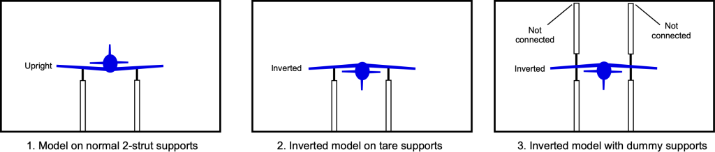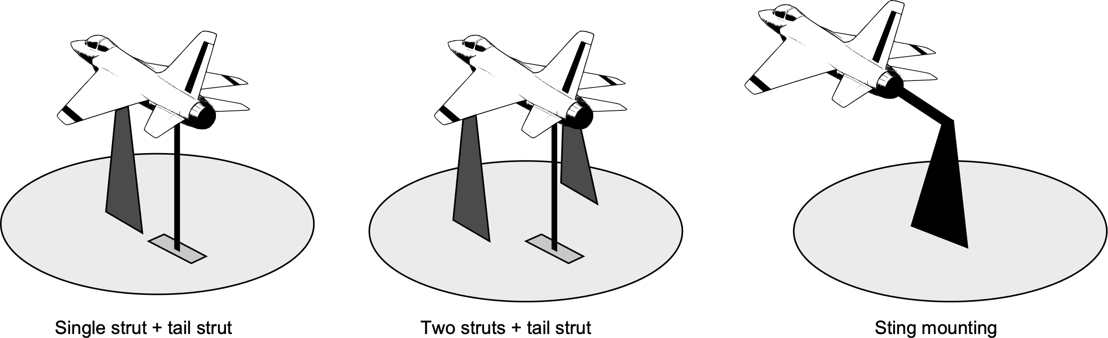 Corrections for wall interference on balance data are another essential step. Empirical correction charts or numerical models are often required to recover free-flight conditions. Most wind tunnel facilities have standard methods of correction, built over years of testing experience, and these should be followed. In particular, stings, struts, and brackets disturb the flow and introduce spurious forces. Their contribution is quantified by tare measurements with the support hardware alone, which are then subtracted from the full-model data.