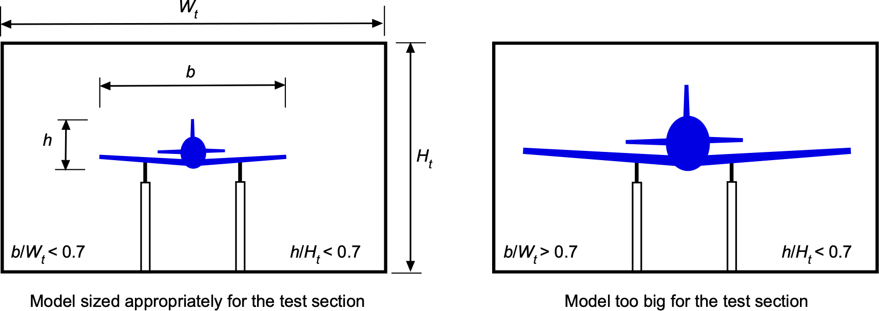 Scaling | Conditions must approximate full scale through Mach and/or Reynolds similarity, sometimes requiring pressurization, cryogenics, or larger models. | Blockage ratio (frontal area of model to test section area) |
