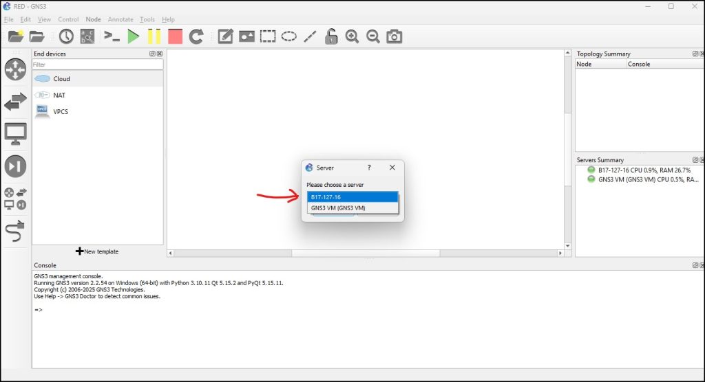 - When asked how to run the cloud, select the PHYSICAL MACHINE (whatever it is called) and not the GNS3VM.