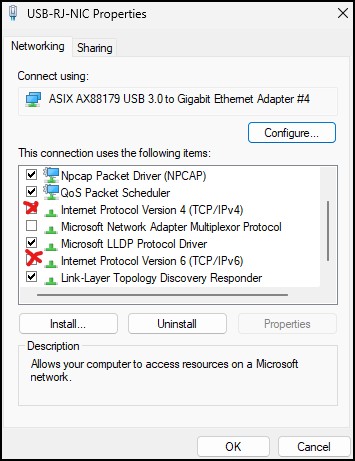 - Turn OFF (no checkmark) for IPv4 and IPv6